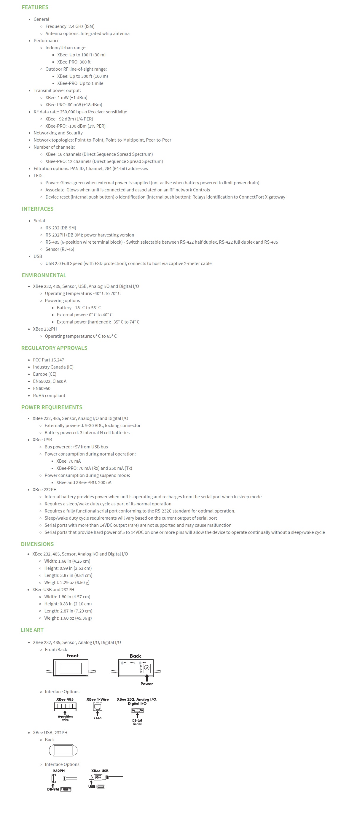 * Outdoor RF line-of-sight range up to 1 mile with XBee-PRO